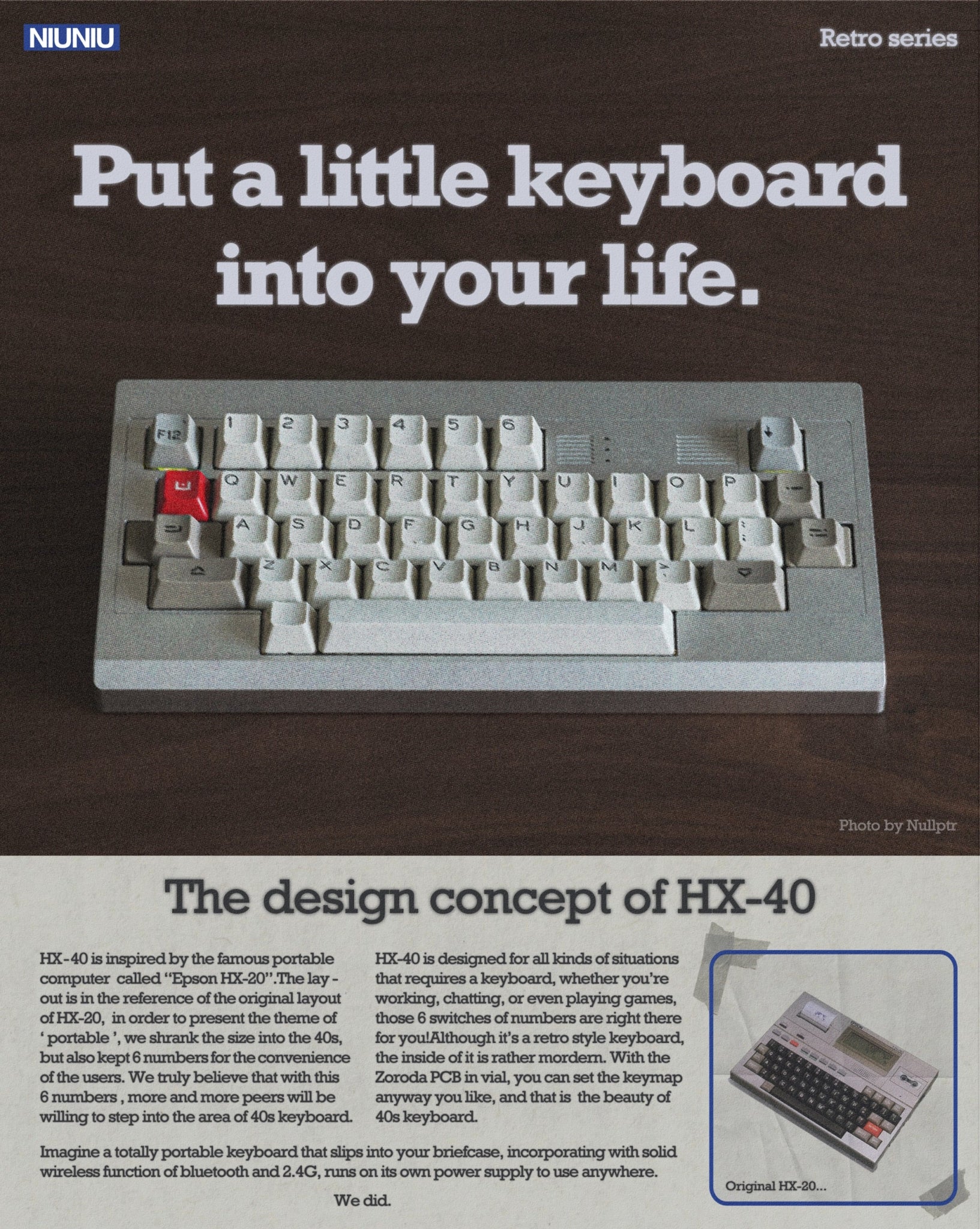 The HX-40 is an exceptional 40% aluminum keyboard kit that stands out for its electro-capacitive technology and iconic design. Developed by Niuniu, this keyboard blends nostalgic aesthetics with a modern typing experience—perfect for purists and sound enthusiasts.