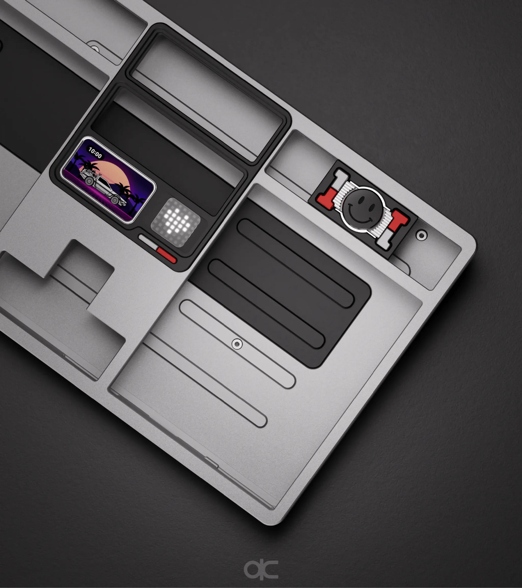 The QK101 continues the design line of the QK80 MK2 and extends it to a 100% layout. As with the QK80 MK2, the display and matrix DOT display can be mounted via QK's own VIA fork. Instead of a leaf spring mount, the QK101 comes with gasket mount and top mount. New are Plates for Plate-Mount Stabilizers (ANSI and 6.25U support only) and the Plate Foam / Cushion which has been directly incorporated into the plate.