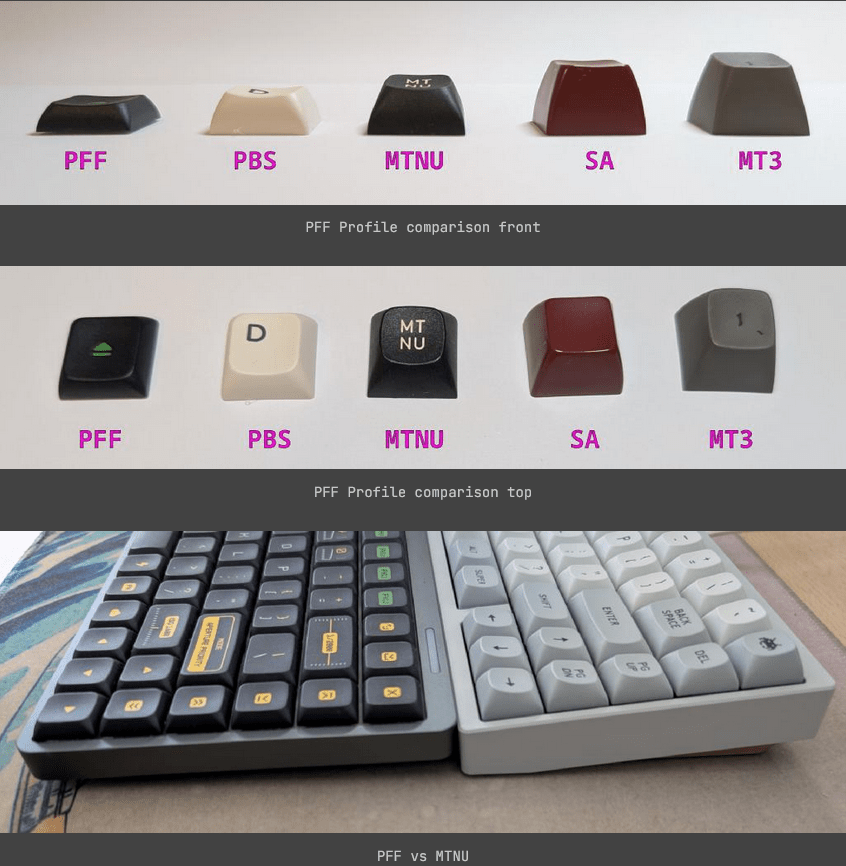 Das PFF‑Profil ist ein uniformes Profil – alle Reihen haben die gleiche Höhe. Die Geometrie kombiniert eine zylindrische Vorder‑ und Rückkante mit einer breiten, sanft sphärischen Top‑Scoop, wodurch ein überraschend komfortables Tippgefühl entsteht. Es ist niedriger als PBS und wurde gezielt für Low‑Profile‑Switches wie Gateron LP oder Kailh Choc V2 entwickelt.