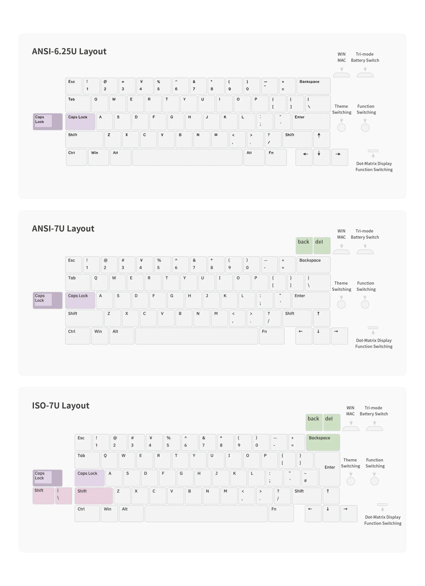 - Support USB-C, Bluetooth, and 2.4GHz connections - Compatible with both ANSI and ISO layouts - Work with WK and WKL cases - Support both 6.25u and 7u spacebars - Use QK's customized VIA web configurator for keymapping and screen customization, as the original VIA doesn't support advanced screen functions